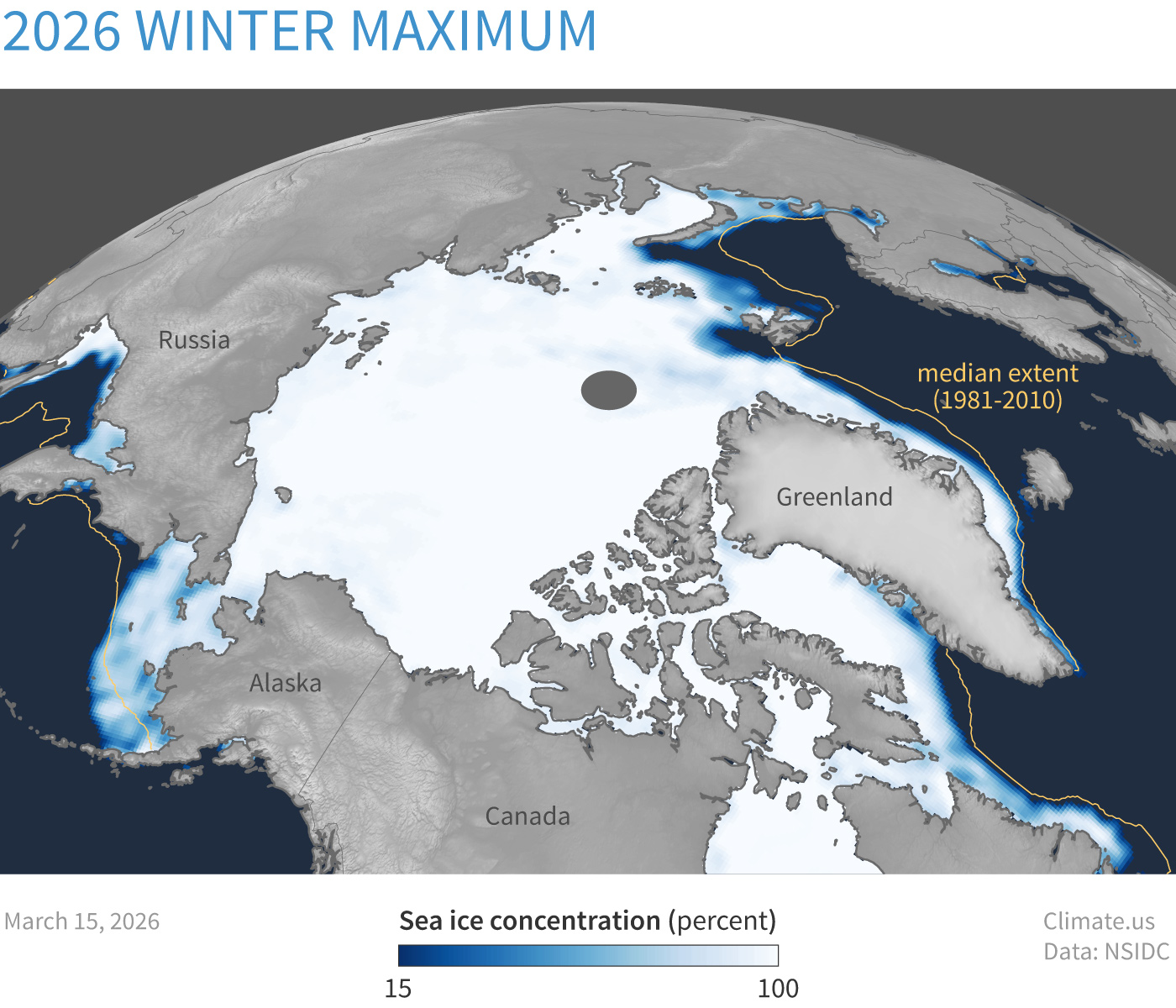 Arctic sea ice likely reached its maximum extent for the year on March 15, 2026, according to the National Snow and Ice Data Center (NSIDC). At 5.52 million square miles (14.29 million square kilometers), the 2026 maximum extent was tied with 2025’s maximum for lowest in the 48-year satellite record. [Extents within roughly 11,600 square miles (30,000 square kilometers) are considered statistically tied.]